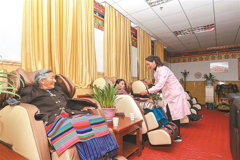 圖為阿里地區(qū)雙集中供養(yǎng)中心里,老人們在保健理療室進(jìn)行按摩保健。記者 格桑吉美 攝(資料圖片)