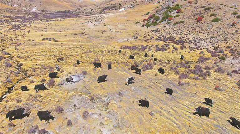 墨竹工卡縣日多鄉(xiāng)拉龍村4組的牧場上,牦牛在悠閑地吃草。記者 格桑倫珠 攝