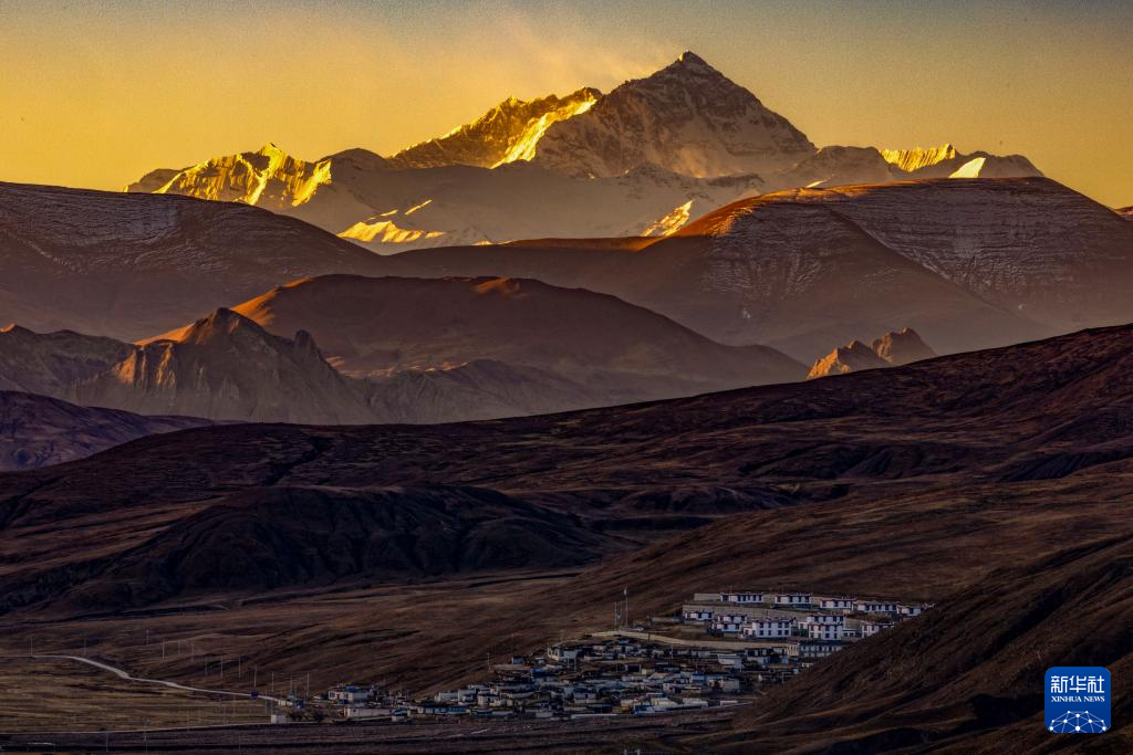 日出時分拍攝的西藏定日縣協(xié)格爾鎮(zhèn)查那村,村中地勢較高處為建成并交付使用的新房(11月13日攝)。新華社記者 姜帆 攝