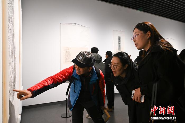 圖為觀眾欣賞展覽中的巖畫石刻拓片作品。中新社記者 貢嘎來松 攝