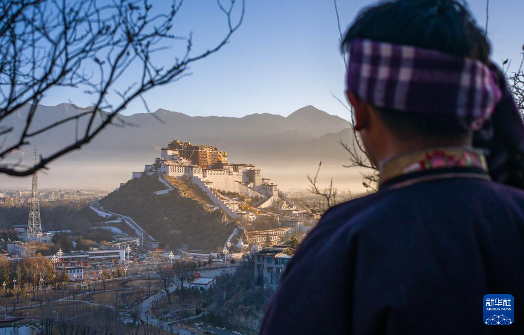 2月18日,拉薩市民在眺望晨光照耀下的布達(dá)拉宮。新華社記者 丁增尼達(dá) 攝