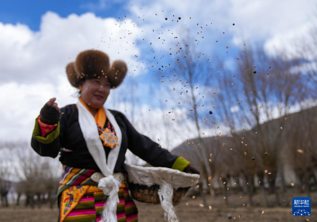 3月16日,西藏山南市結(jié)巴鄉(xiāng)結(jié)巴村村民身著盛裝,在新犁開的田地上播撒種子。新華社記者 晉美多吉 攝