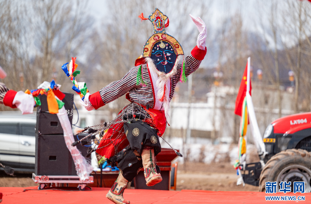 3月16日,西藏拉薩市林周縣春堆鄉(xiāng)春堆村村文藝隊(duì)在春耕儀式上表演藏戲。新華網(wǎng) 旦增努布 攝