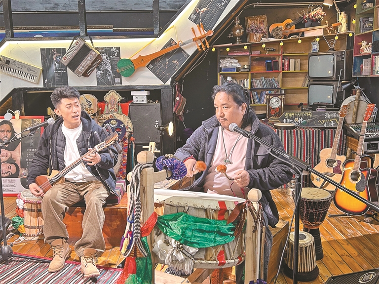 圖為旦增益西(左)使用新一代扎念琴進(jìn)行彈唱。記者 曉勇 羅宗 攝