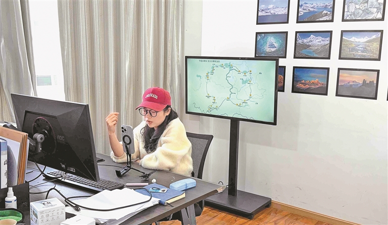 圖為工作人員在直播間講解西藏旅游的相關(guān)內(nèi)容。