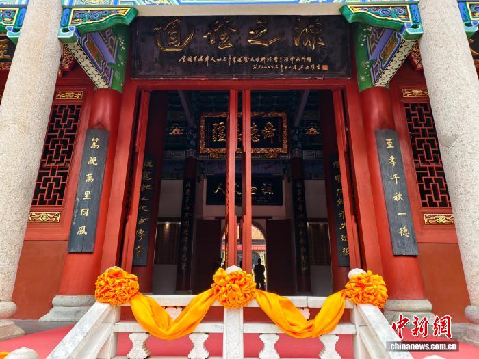 2025年10月28日,200余名海峽兩岸同胞在湖南省永州市寧遠(yuǎn)縣九嶷山瑤族鄉(xiāng)舜帝陵,參加“祭舜帝 傳仁心 旺天下”乙巳年旺旺集團(tuán)祭祀舜帝典禮,共祭中華民族的人文始祖舜帝。圖為九嶷山舜帝陵拜殿入口。中新社記者 胡默達(dá) 攝