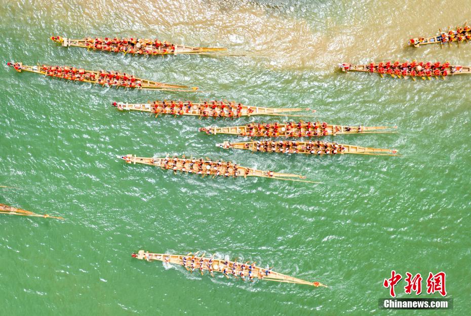 18日,“理傳千年 龍騰四?!焙嫌乐菔械揽h2023年端午節(jié)“紫金杯”國(guó)家非遺龍船賽在該縣瀟水河畔鳴鑼開(kāi)賽。此次國(guó)家非遺道州龍船賽吸引該縣12個(gè)鄉(xiāng)鎮(zhèn)(街道)、73個(gè)村(社區(qū))、172艘龍船、4816名民間運(yùn)動(dòng)員參賽。圖為172艘龍船、4816名民間運(yùn)動(dòng)員參賽。