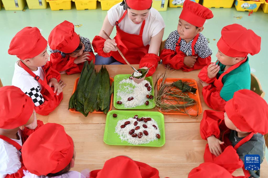 6月19日,山東省煙臺(tái)市福山區(qū)清洋街道中心幼兒園的小朋友在老師指導(dǎo)下學(xué)習(xí)包粽子。新華社發(fā)(孫文潭 攝)
