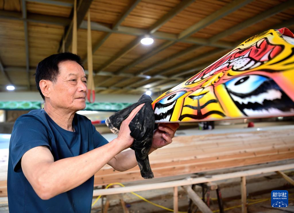 6月3日,福州市非物質(zhì)文化遺產(chǎn)“方莊龍舟制造技藝(閩侯縣)”的傳承人方紹晃在擦拭準備交付的龍舟船頭。新華社記者魏培全攝