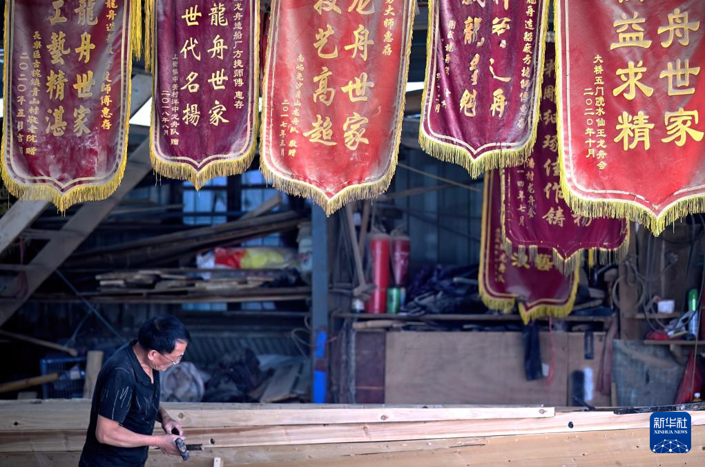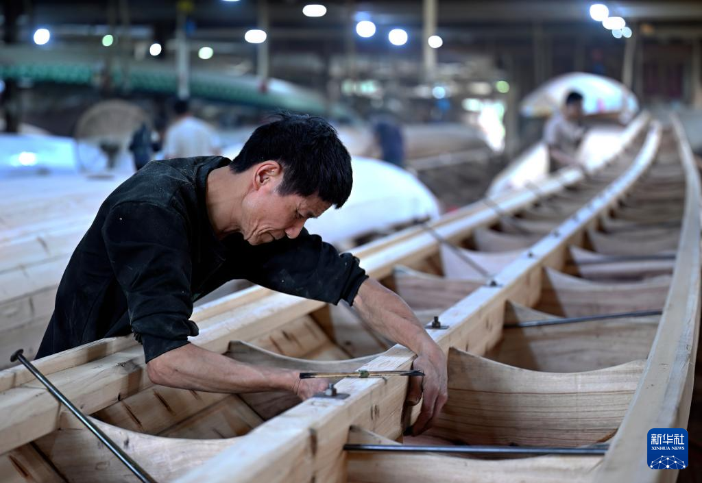 6月3日,在閩侯縣方莊村的方和勇龍舟廠里,工人在趕制端午節(jié)的龍舟訂單。新華社記者魏培全攝