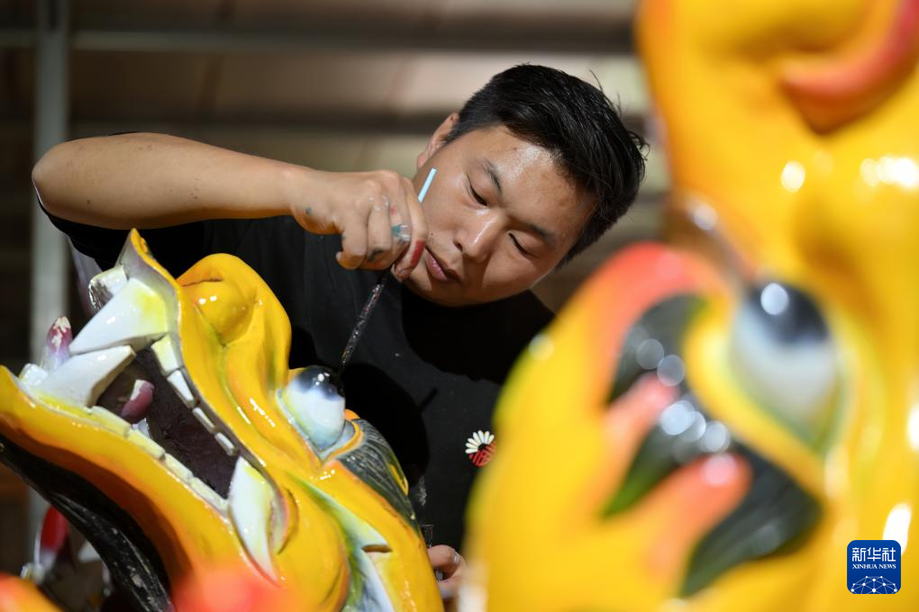 6月3日,工人在給一顆新龍頭上色。龍舟龍頭的制作最為復(fù)雜,需用幾十把不同的修光刀進行加工,再進行切割、噴漆、上色等步驟。新華社記者魏培全攝