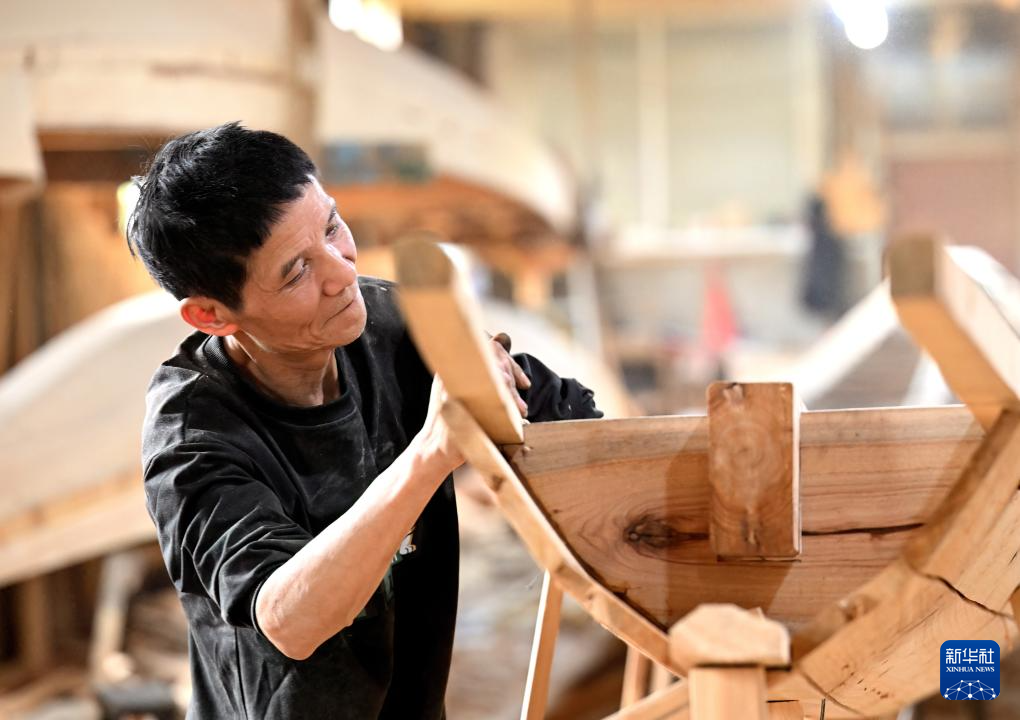 6月3日,在“龍舟世家”方忠雄龍舟廠,一名木工師傅在趕制端午節(jié)的龍舟訂單。新華社記者魏培全攝