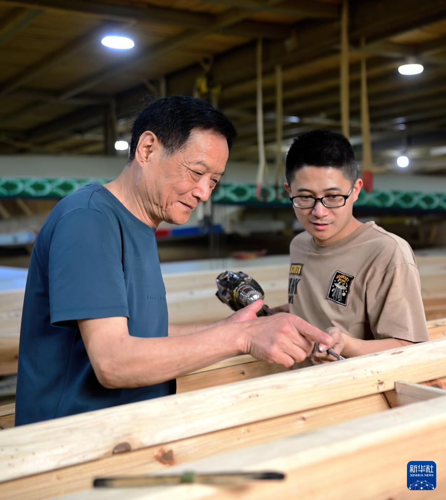 6月3日,福州市非物質(zhì)文化遺產(chǎn)“方莊龍舟制造技藝(閩侯縣)”的傳承人方紹晃(左)在給侄兒方劍偉(右)傳授福州傳統(tǒng)龍舟制作技藝。方劍偉現(xiàn)在是“方莊龍舟制造技藝(閩侯縣)”第四代傳承人。新華社記者魏培全攝