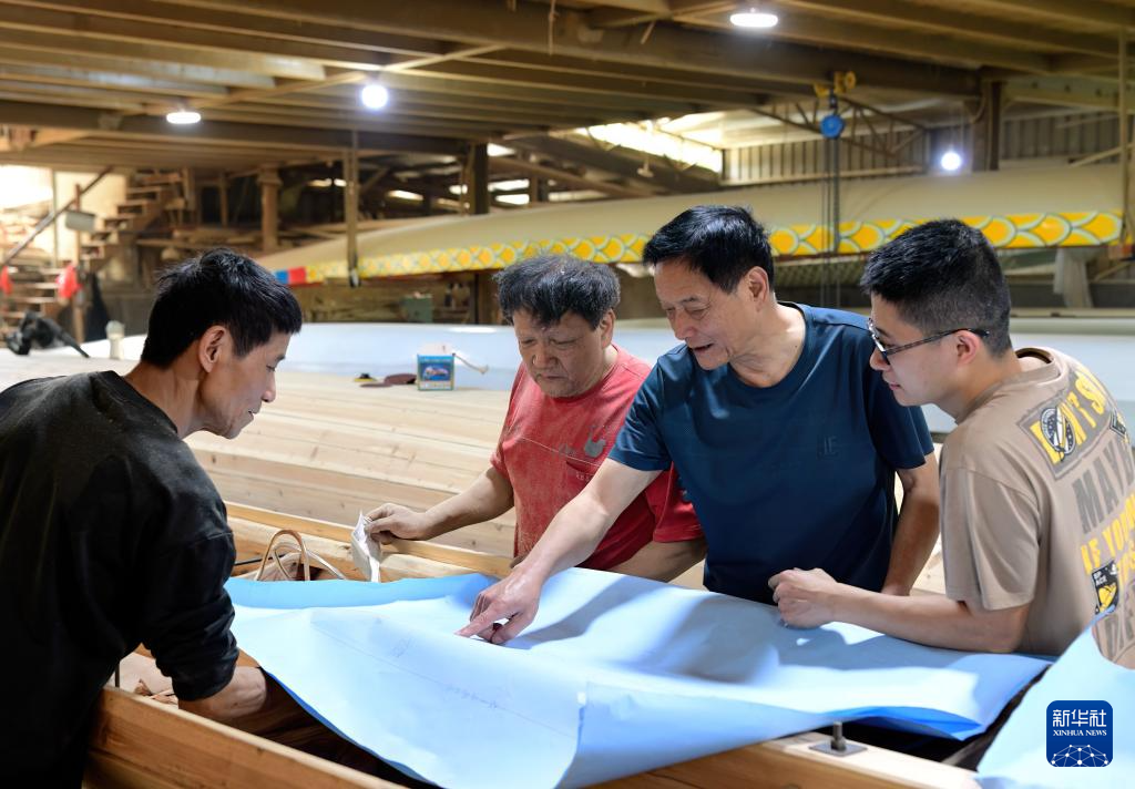6月3日,福州市非物質(zhì)文化遺產(chǎn)“方莊龍舟制造技藝(閩侯縣)”的傳承人方紹晃(右二)與家人們一起探討龍舟的制作工藝。新華社記者魏培全攝