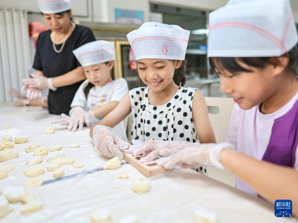 8月26日,在華能山東石島灣核電有限公司生活區(qū)食堂,暑期托管班的孩子制作傳統(tǒng)七夕美食巧花。新華社發(fā)(李信君 攝)