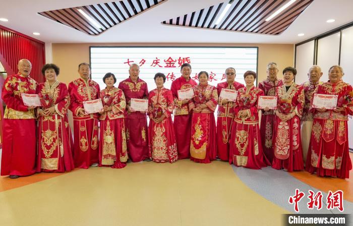 七夕將至,河北省邯鄲市老人走進叢臺區(qū)光明橋街道天璽苑社區(qū),參加“七夕迎金婚 共創(chuàng)好家風(fēng)”慶典,回憶半個世紀的愛情。金婚慶典儀式經(jīng)過牽手入場、夫妻對拜、執(zhí)子之手、回憶往昔等環(huán)節(jié),見證了金婚夫妻們相濡以沫、互敬互愛的美滿婚姻。金婚老人結(jié)合親身經(jīng)歷,分享家風(fēng)家訓(xùn)及愛情故事,講述家庭幸福的秘訣,“曬”出婚姻保鮮的秘籍,分享婚姻的經(jīng)營智慧。圖為8月6日,金婚夫妻合影留念。王倩倩 攝