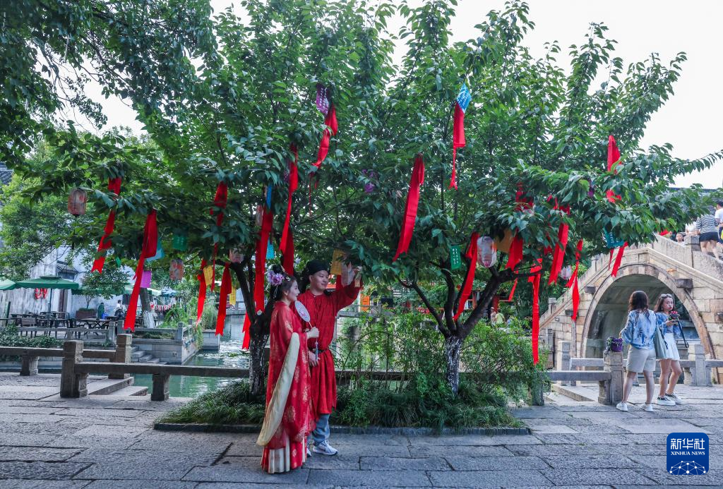 8月26日,在嘉興市南湖區(qū)月河歷史街區(qū),游客身著傳統(tǒng)服飾在七夕許愿樹(shù)下拍照。新華社記者 徐昱 攝