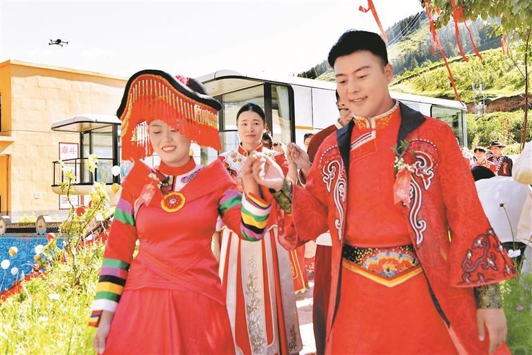 當(dāng)天,在觀眾的祝福下,22對夫婦共進(jìn)“七夕情人康養(yǎng)餐”,漫步情人林,體驗原生態(tài)土族婚禮,品鑒非物質(zhì)文化遺產(chǎn)土族圈圈席,觀看大型原創(chuàng)歌舞劇《彩虹部落》,沉浸式感受了一場融合秀美自然風(fēng)光、多民族婚俗、非遺技藝展示、歌舞展演的七夕盛宴。