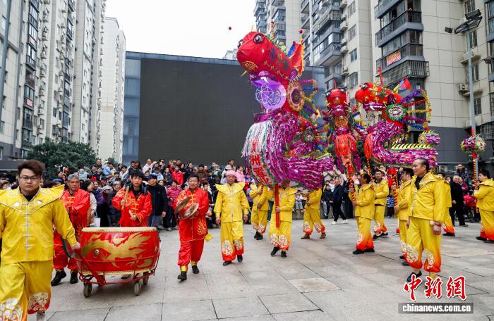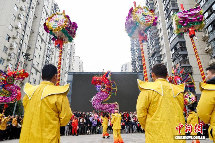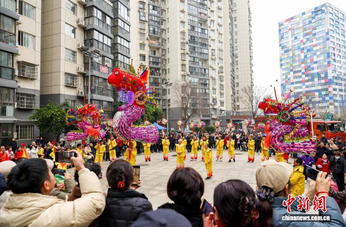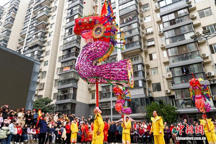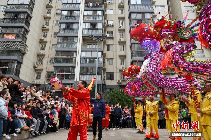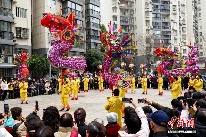 2月27日,湖北武漢,國(guó)家級(jí)非遺漢陽(yáng)高龍走進(jìn)社區(qū)進(jìn)行表演,以傳統(tǒng)民俗為居民送上馬年元宵祝福。圖為高龍表演吸引民眾觀看。中新社記者 張暢 攝