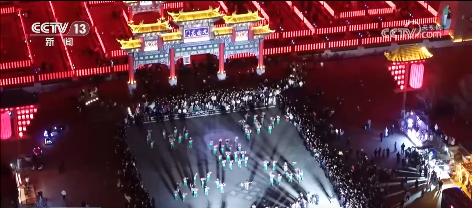 九曲燈陣占地面積近20畝,外部方正、內(nèi)部曲折,宛如“九曲十八彎”的黃河。游客們跟隨奏樂(lè)隊(duì)伍,進(jìn)入九宮九格的迷宮,穿行全長(zhǎng)2.4公里的回廊,依次走過(guò)寓意著“福祿壽喜”的九個(gè)曲陣。兩邊的燈籠上懸掛著百家姓和十二生肖,游客們可以一邊轉(zhuǎn)九曲,一邊尋找印有自己姓氏和屬相的紅燈籠,沉浸式體驗(yàn)元宵佳節(jié)的喜慶氛圍。除了九曲燈陣,社火展演、主題光影秀、無(wú)人機(jī)煙花秀也輪番上演。據(jù)了解,該活動(dòng)將一直持續(xù)到正月十五。