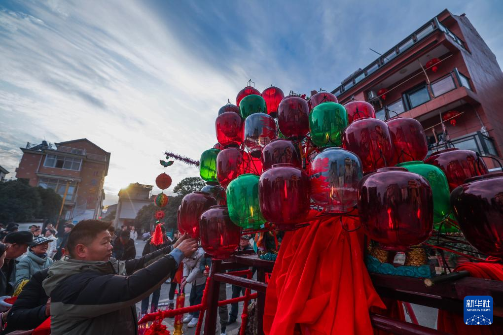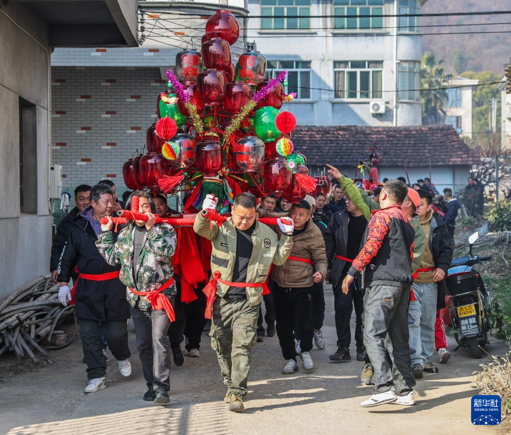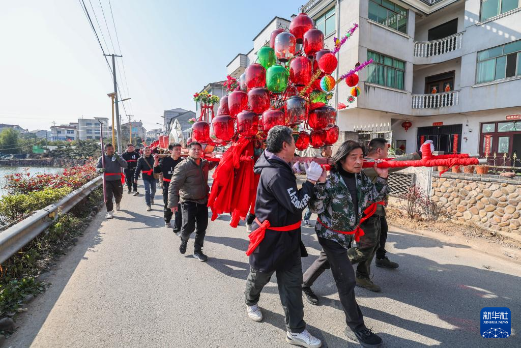 2月10日,赤松鎮(zhèn)虎巖村村民抬著板凳龍在村里巡游。