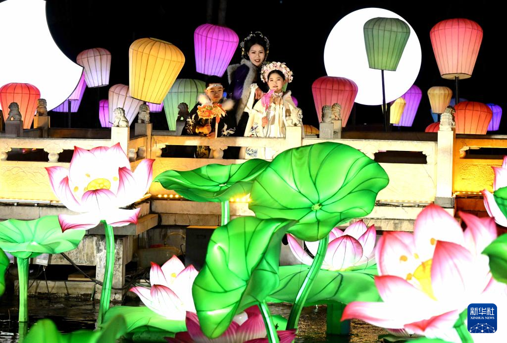 2月8日晚,身著傳統(tǒng)服飾的游人在河北省石家莊市正定榮國府影視基地內游園賞花燈。