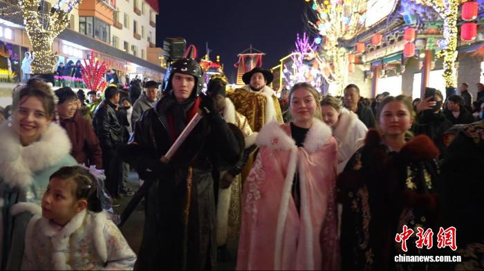 2月27日晚,身著各式傳統(tǒng)服飾的海外友人穿行于遼寧朝陽慕容街。 韓浩天 攝