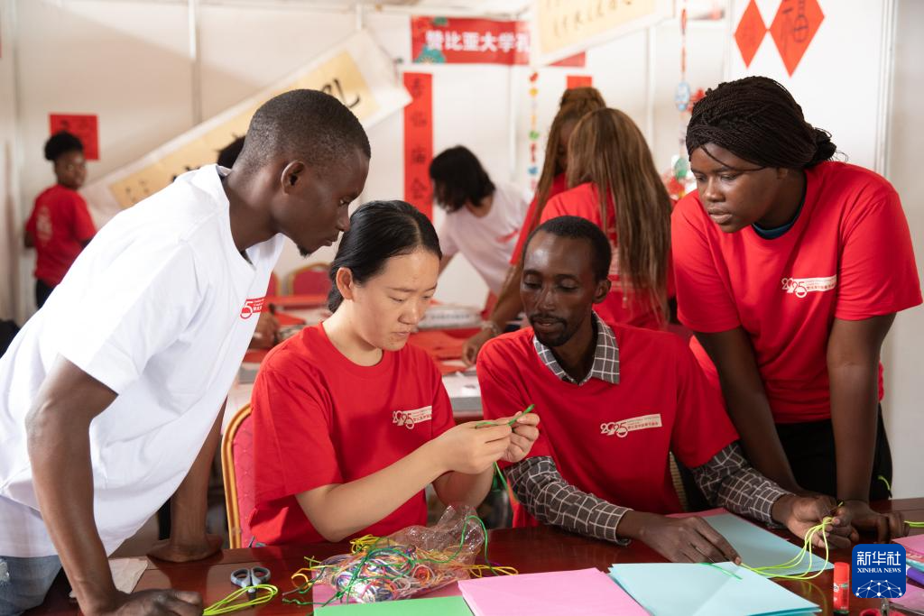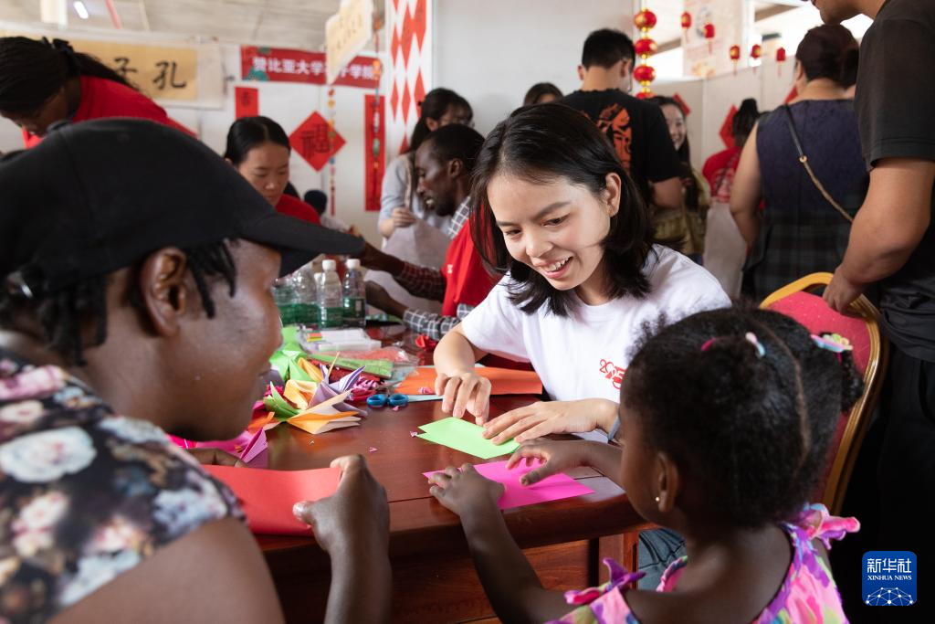 在廟會現(xiàn)場的贊比亞孔子學(xué)院展位前,人頭攢動。包括書法體驗(yàn)、剪紙、折紙展示和猜字謎等豐富的文化互動項(xiàng)目,吸引人們紛紛參與體驗(yàn)。一位贊比亞媽媽帶著孩子在老師指導(dǎo)下完成她的第一個(gè)中國結(jié)作品,她高興地說:“原來中國藝術(shù)這么有趣!希望我的孩子有一天可以去孔子學(xué)院學(xué)習(xí)。”