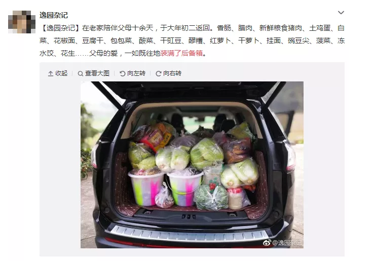 昨日,游子們從家這個(gè)港灣里,鳴笛啟航,奔向遠(yuǎn)方。除了對(duì)鄉(xiāng)愁的百轉(zhuǎn)千回,更有親情的濃郁化不開。這幾天,網(wǎng)友們都在微博里曬圖,“媽媽給裝的后備箱”的話題,一時(shí)成了熱點(diǎn)——“親手做的馬蹄糕”“最愛的家鄉(xiāng)小柚柑”“一大罐子土榨花生油”“秋天腌的糖蒜”……后備箱被爸媽塞得滿滿的,不愿帶還不高興。于是乎,調(diào)皮的網(wǎng)友留言:“明年我開個(gè)貨車回來(lái)過(guò)年!”