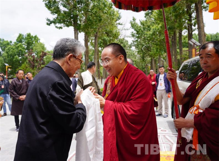 圖為西藏自治區(qū)黨委常務(wù)副書記、區(qū)政協(xié)黨組書記丁業(yè)現(xiàn)(右)向十一世班禪敬獻(xiàn)哈達(dá)。攝影:王淑