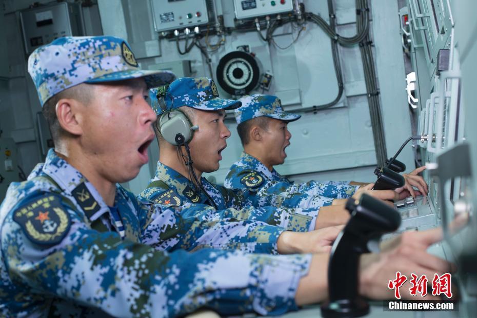 記者近日登上??谂灒嚯x探訪這艘被譽(yù)為“中華神盾”的海軍艦艇。圖為??谂炦M(jìn)行防空反導(dǎo)演練期間,官兵操縱副炮打擊來襲目標(biāo)。(資料圖片)中新社記者 王棟 攝