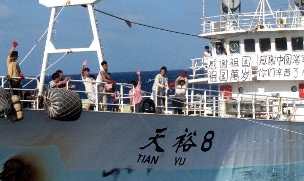 看到??谂?,“天裕8號(hào)”船員就像見(jiàn)到了久違的親人,紛紛走上甲板,歡呼著向??谂灀]手致意,并在船上升起一面鮮艷的五星紅旗。他們年齡大約在二十歲左右,在甲板上行走如飛,如履平地一般。