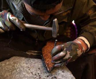 作為銅雕鎦金雪堆白手藝傳承人之一的米瑪已經(jīng)跟隨師傅多年。他告訴記者,無(wú)論是建造寺廟的金頂還是浮雕,都需要大量的銅皮。這些銅皮主要用的是黃銅、紫銅和紅銅。將材料備好之后,先用墨筆繪畫(huà)出物體的輪廓到紙上,再?gòu)?fù)制到銅皮上,然后把銅皮放到木砧上反復(fù)敲打,具象的表面輪廓被逐漸敲打而出,而后再進(jìn)行雕刻。