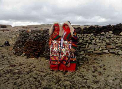 瑪旁布姆卡是西女國女王居住的城堡,普蘭縣文化局局長加措根據(jù)藏文大字典和《阿里史地探秘》的“瑪旁布莫卡”,解釋出“布”的漢文詞義,就是女人、女性、女子或者女王。“莫”就是香草或者香草遍布此山。據(jù)當(dāng)?shù)匕傩战榻B,城堡遺址坐落在普蘭神湖瑪旁雍措湖的東部扎藏布溫泉溝南側(cè)的野嶺上,海拔5000米上下。在遺址上部高處還有一個碩大蘑菇形狀的巖石巋然迎風(fēng)屹立城堡上方,與下方城堡遺址交相輝映。這即是“出俞石、朱砂、麝香、牦牛、駿馬、蜀馬,尤多鹽,恒將鹽向天竺興販,其利數(shù)倍”西女王國的王城。在城堡上方更高處的山后,遺留有眾多的洞穴,說明女國的百姓就居住在女王的周圍。此外在山坡的下方扎藏布溝處,當(dāng)?shù)匕傩辗Q這塊地方為“卡爾青”,意思是大城堡之地。盡管史書上的記載十分有限,瑪旁布姆卡的故事仍然世世代代流傳在當(dāng)?shù)匕傩盏男闹小;魻柎逡晃荒赀~的老百姓告訴筆者,溫泉溝和曲古寺廟附近就有許許多多女王的傳說,聽說女王曾經(jīng)在此沐浴,但不知具體在什么地方。