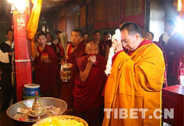 在一片嗩吶聲中,班禪來到五世至九世班禪合葬靈塔“班禪東陵扎什南捷殿”。班禪首先摘去黃色尖頂僧帽,向靈塔叩拜三次,然后同自己的經(jīng)師和在場的僧人一道,念誦經(jīng)文祈禱。攝影:王淑。