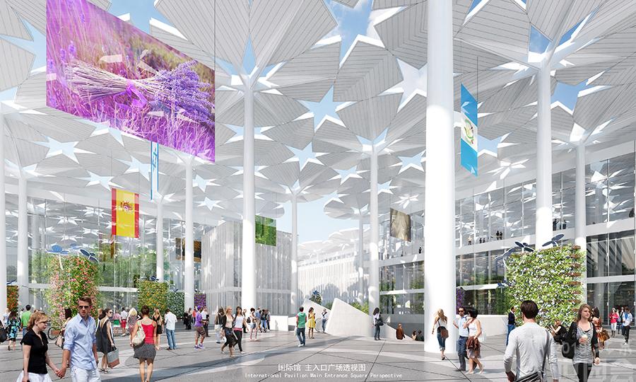 此外,國際館利用建筑遮陽、自然通風(fēng)、太陽能光伏發(fā)電、蒸發(fā)冷卻降溫、滴灌技術(shù)和雨水回收利用等可持續(xù)技術(shù),成為一座綠色、環(huán)保的低能耗建筑。外立面采用玻璃幕墻,并在頂面設(shè)計(jì)了天窗,最大限度保證場(chǎng)館的自然采光和通透性?;▊愕牧⒅蓪⑹占菝嬗晁?,使其滲入蓄水池,當(dāng)雨水過多時(shí),將會(huì)流入排水溝,用于景觀用水、綠化用水、路面沖洗等。在花傘的上方采用新型光伏發(fā)電材料,提高光伏發(fā)電效率,用于整個(gè)建筑的內(nèi)照明、動(dòng)力等用能需求。
