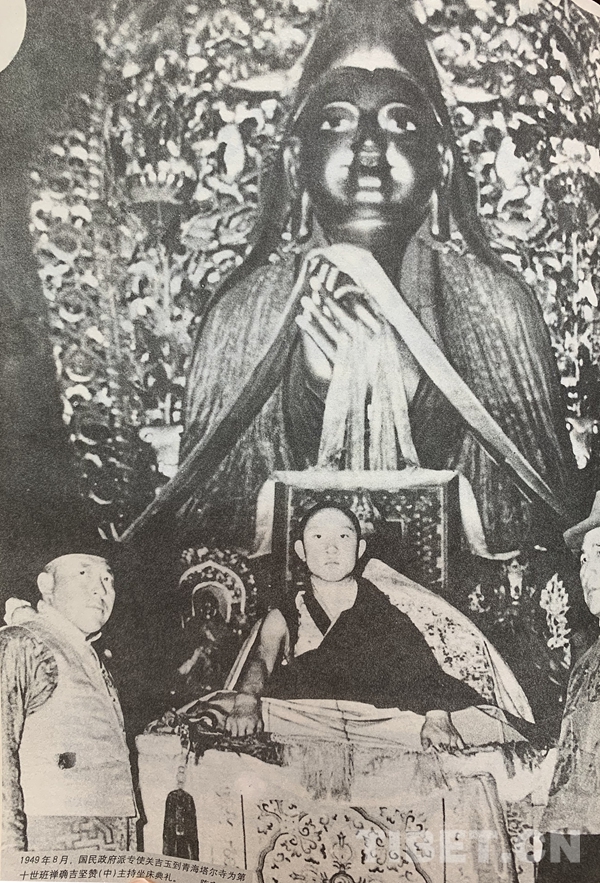 1949年8月,國民政府派專使關吉玉到青海塔爾寺為十世班禪額爾德尼o確吉堅贊(中)主持坐床典禮。(圖片翻拍自《金鑰匙o十七條協(xié)議》 陳宗烈提供)