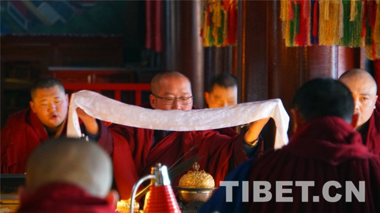 圖為法師舉哈達誦經(jīng)。