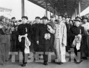 1951年4月27日,十世班禪首次進京,周恩來總理、朱德總司令等黨和國家領導人前往北京火車車站迎接。