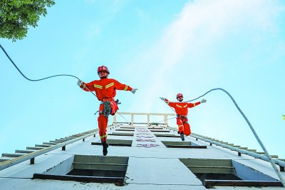 寧夏中衛(wèi)市消防救援支隊(duì)消防員進(jìn)行“單繩速降”科目訓(xùn)練。應(yīng)急管理部消防救援局提供