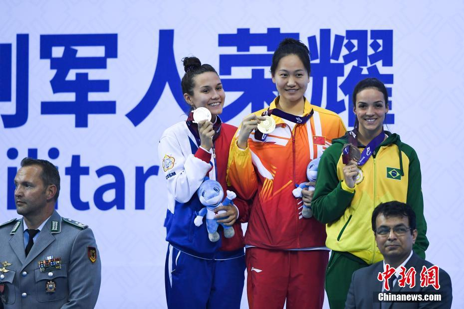 10月23日晚,中國選手陳潔以27.81秒的成績獲得女子50米仰泳冠軍,并打破國際軍事體育理事會紀(jì)錄。圖為陳潔在頒獎儀式上。中新社記者 何蓬磊 攝