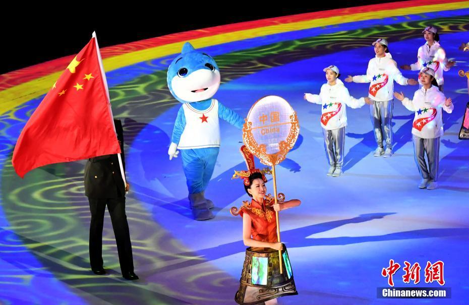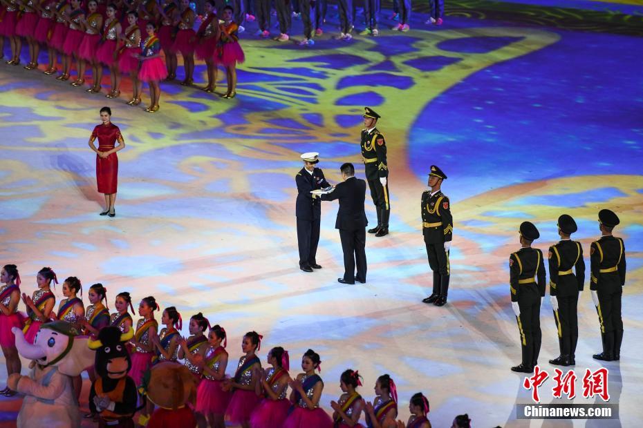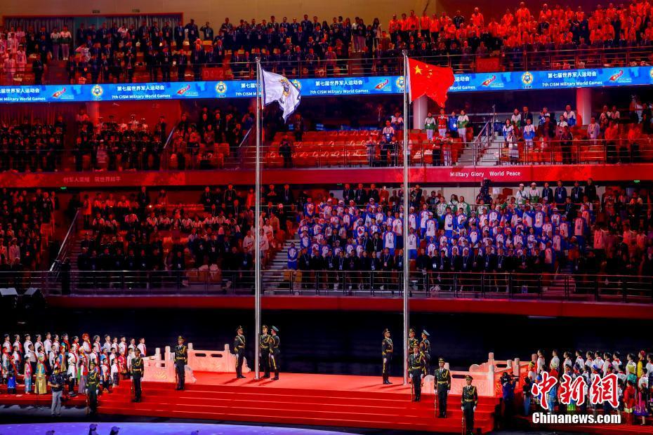 圖為閉幕式現(xiàn)場降國際軍事體育理事會會旗。 中新社記者 何蓬磊 攝