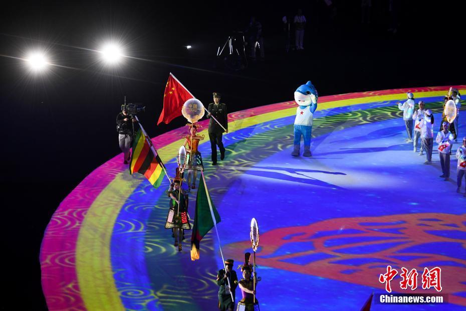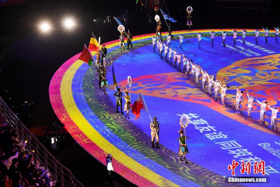 圖為各參賽國國旗入場。 中新社記者 何蓬磊 攝