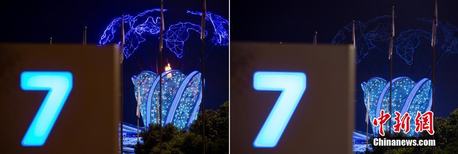 圖為本屆軍運會圣火熄滅前和熄滅后的對比(拼版圖片)。 中新社記者 侯宇 攝