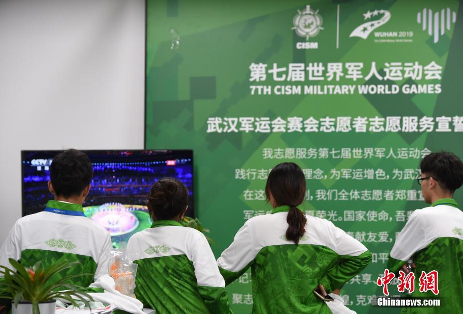 圖為本屆軍運會志愿者“小水杉”關注閉幕式直播。 中新社記者 侯宇 攝