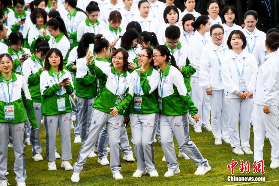 圖為參加運動員村開村儀式的工作人員自拍留影。中新社記者 張暢 攝