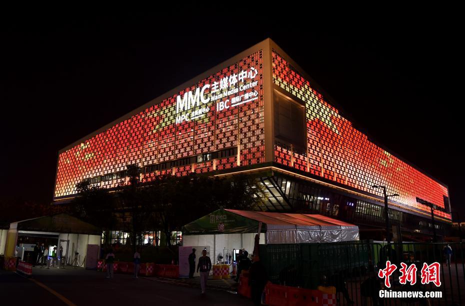 圖為夜色中的主媒體中心外景。 何蓬磊 攝