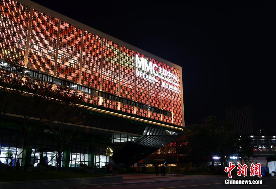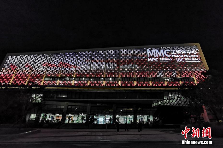 圖為夜色中的主媒體中心外景。 侯宇 攝