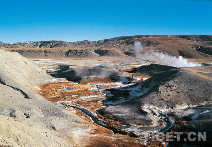 羊八井熱水湖。這個(gè)熱水湖應(yīng)當(dāng)源于歷史上的一次大規(guī)模水熱爆炸,再由地下熱水補(bǔ)充而成。羊八井熱田開(kāi)發(fā)后,地下熱水的水位下降,壓力減小,致使熱水湖漸趨干涸。