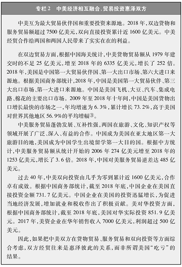 中美經(jīng)貿(mào)關(guān)系是兩國關(guān)系的“壓艙石”和“推進器”,事關(guān)兩國人民根本利益,事關(guān)世界繁榮與穩(wěn)定。兩國建交以來,雙邊經(jīng)貿(mào)關(guān)系持續(xù)發(fā)展,合作領(lǐng)域不斷拓寬,合作水平不斷提高,形成了高度互補、利益交融的互利共贏關(guān)系,不僅兩國受益,而且惠及全球。